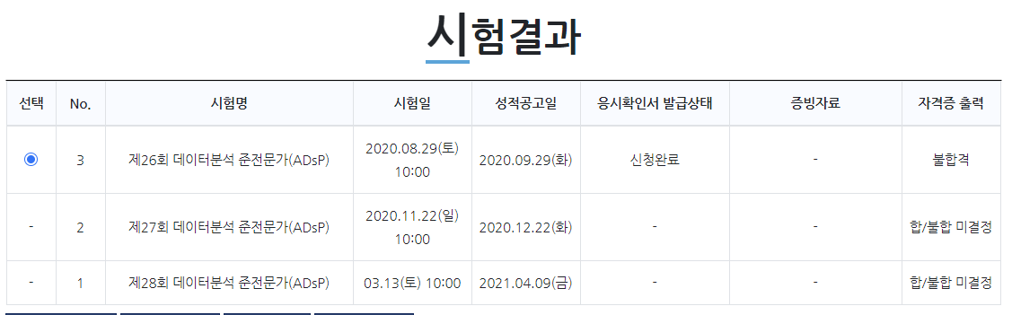 저는 Adsp 시험을 총 3번 신청했고, 2번 응시했습니다.