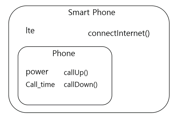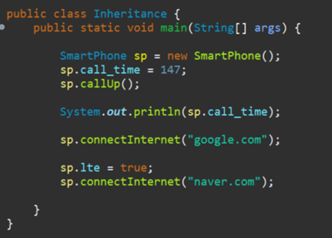 조상 클래스(Phone)의 멤버(power, call_time)와 자손 클래스의 멤버(lte)가 합쳐진 하나의 인스턴스로(sp) 생성된다.