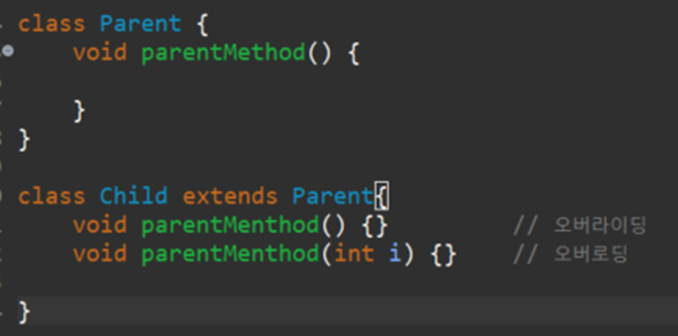 상속받은 메서드를 그대로 사용하기도 하지만, 자손 클래스 자신에 맞게 변경 해야하는 경우 조상의 메서드를 오버라이딩 한다.