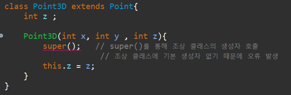 → 하지만, 조상 클래스에서 기본 생성자로 선언하지 않았을 경우(매개변수 있는 생성자로만 선언했을 경우 컴파일 에러가 발생한다.)
