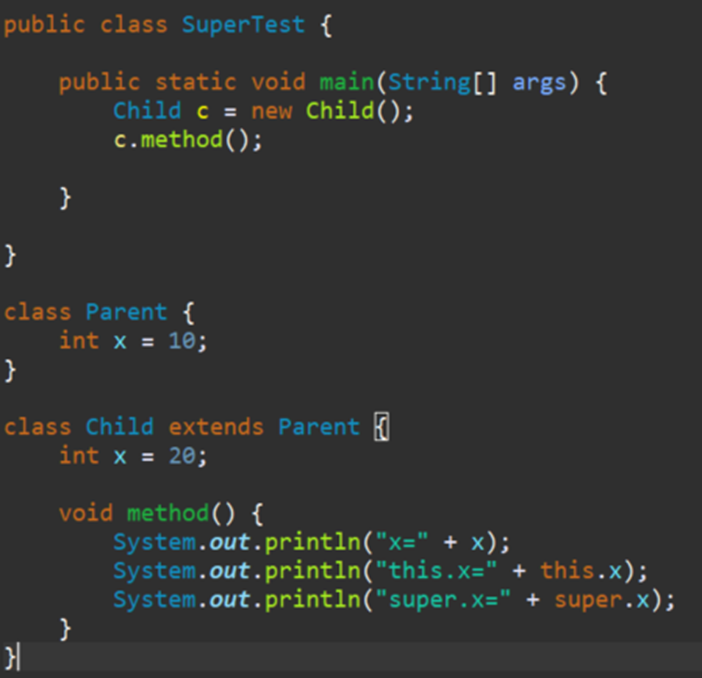 같은 이름의 멤버변수가 조상 클래스인 Parent에도 있고 자손 클래스인 Child 클래스에도 있을 때는 super.x와 this.x는 서로 다른 값을 참조하게 된다.