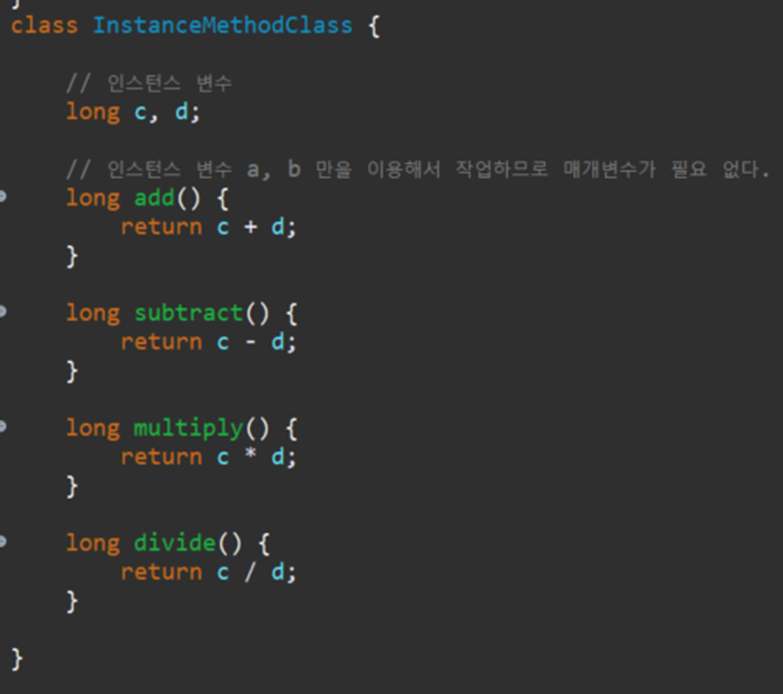 위와 같이 인스턴스 변수(c, d)를 사용하여 메서드 로직을 실행한다.