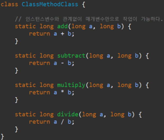 ● 인스턴수 변수와 관계없이 매개변수 만으로 작업이 가능하다. (매개변수가 필요하다.)