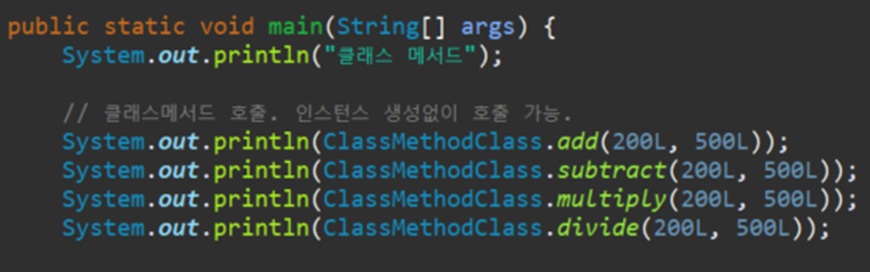 클래스 메서드도 특별한 과정(인스턴스 생성 등)없이 바로 호출 할 수 있다.