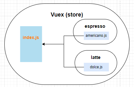 같은 레벨에 espresso, latte 모듈 폴더를 만들고 각 레이아웃(컴포넌트)에 매핑시킬 store js 파일을 생성했습니다.