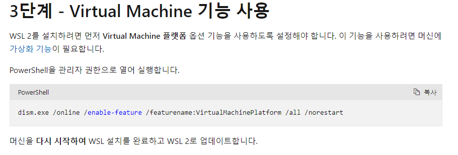 WSL 2를 설치하면 된다는 댓글을 참고해 아래와 같이 하나씩 차근차근 설치하였더니 도커를 정상적으로 실행할 수 있었습니다!