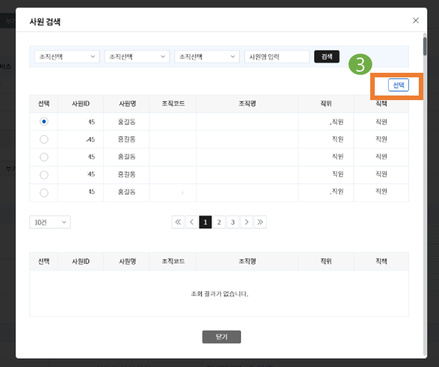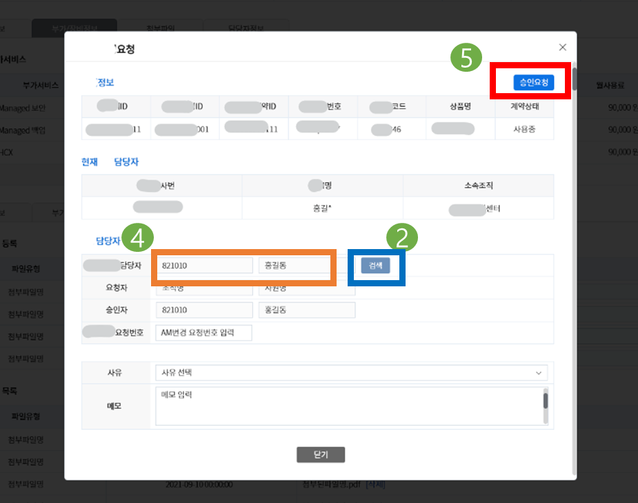 (1) 페이지에서 하나의 row 선택 후 등록 버튼 -> (2) 요청 Form 팝업의 검색 버튼-> 검색 팝업으로 진행되며