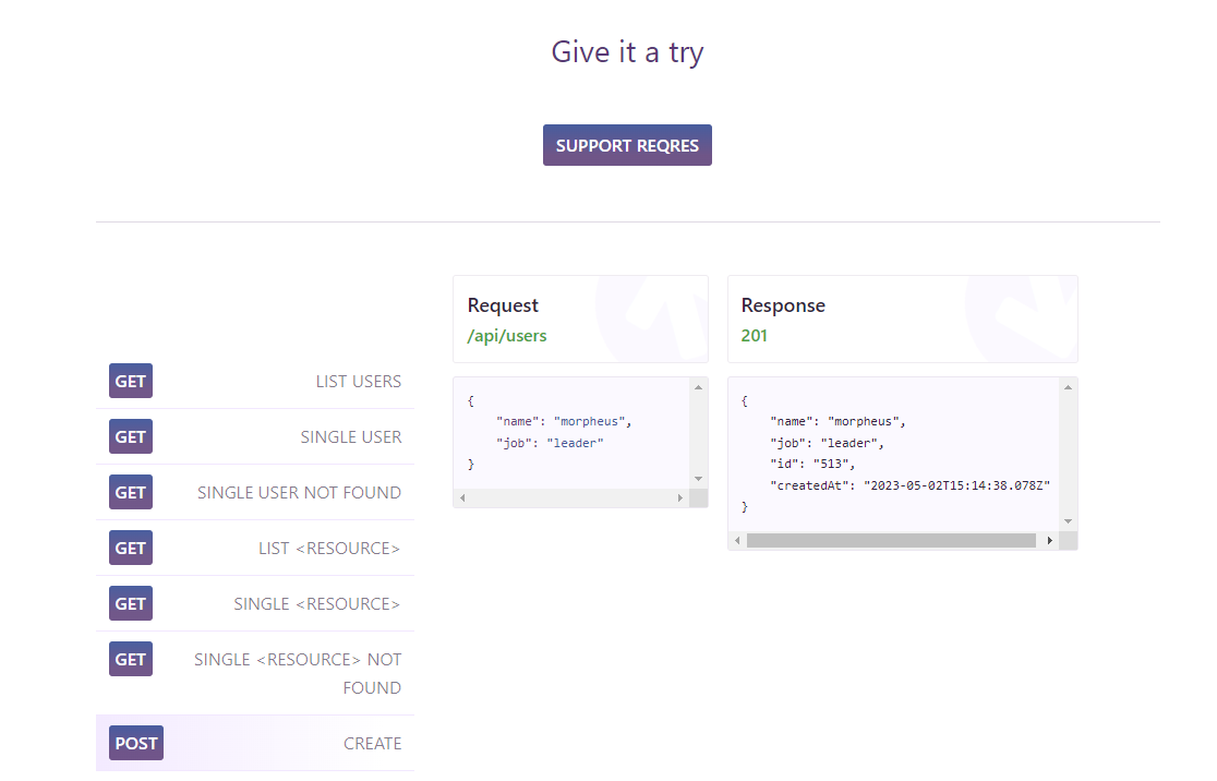 Axios 통신 예제를 사용하기 위한 통신 API는 https://reqres.in/ 에서 제공하는 API를 이용했습니다.