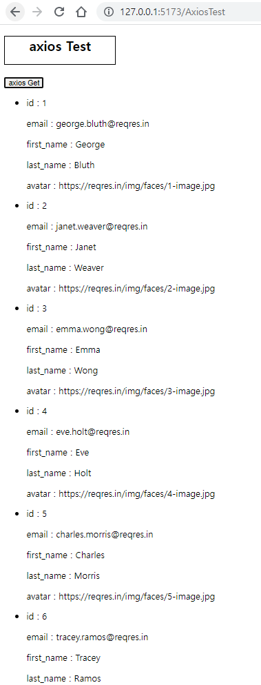 해당 데이터는 https://reqres.in/api/users?page=1 에서도 바로 확인할 수 있습니다.