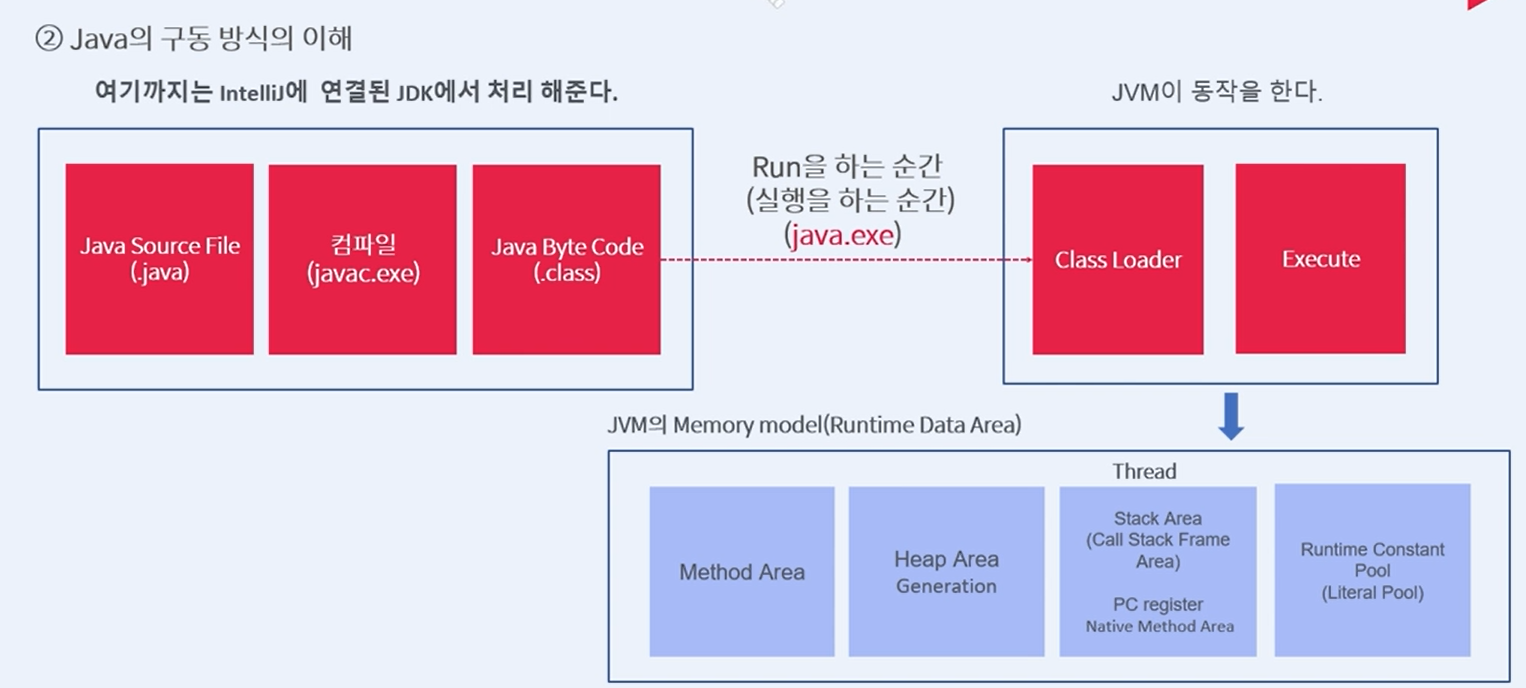 -> Run 클릭 시, java.exe 가 해당 java.class 파일 실행(명령어)을 JVM에 요청
